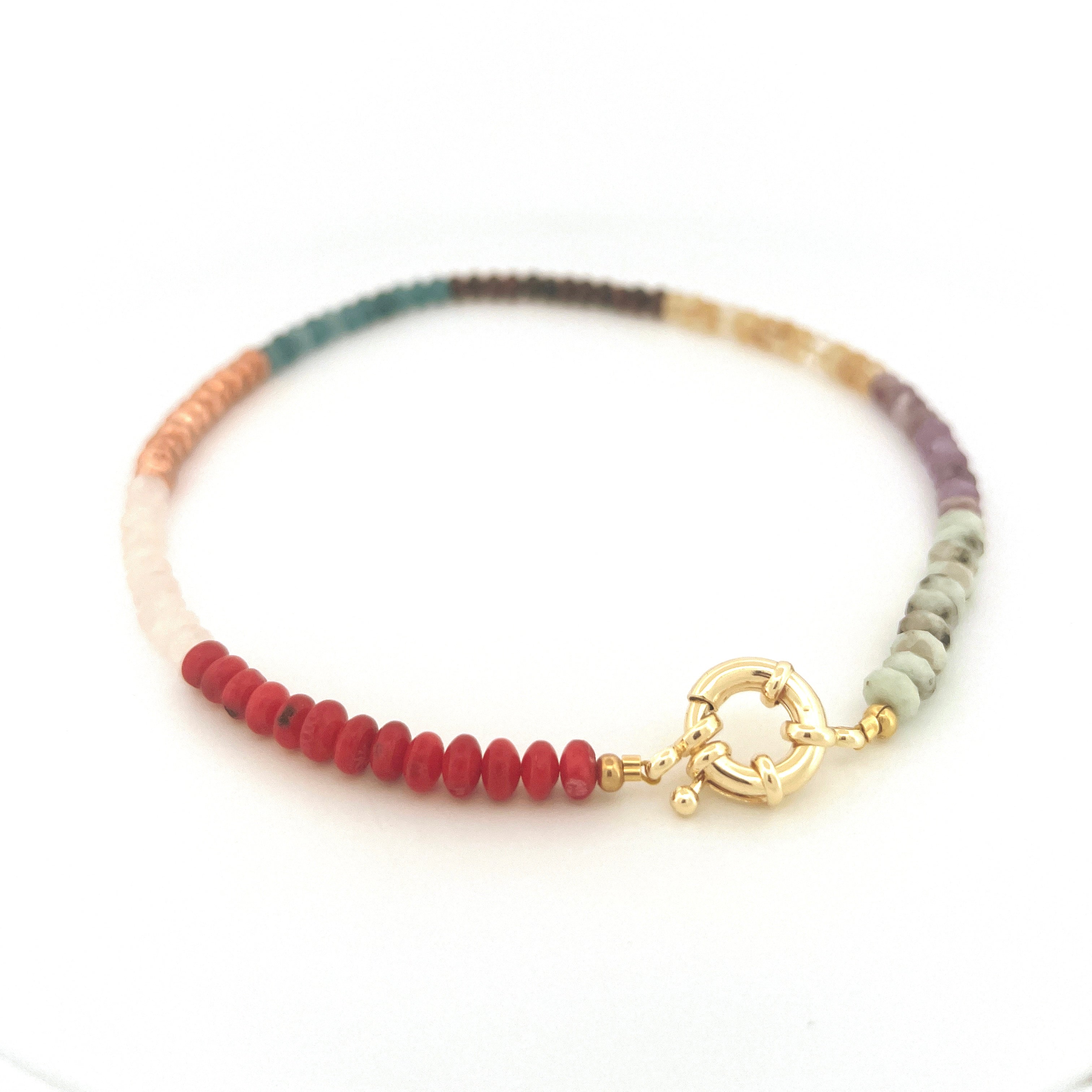 Experience timeless elegance with this 18” necklace, featuring a sophisticated closure designed for versatility—wear it to the front for a statement or to the back for a subtle touch. Adorned with exquisite rondelle beads of Hematite, Aquamarine, Rose Quartz, Coral, Ágatas, Tiger Eye, Amethyst, and Moonstone, it exudes natural beauty and charm.