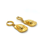 Indulge in the glamour of the wild west with our Pantallas de Argolla con Gorro - Rodeo Hat Earrings. These 18k gold plated earrings feature dainty, lightweight cowgirl hats for a touch of rustic charm on any occasion. Walk tall and make a statement with these luxury accessories.