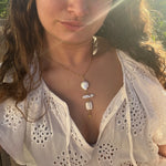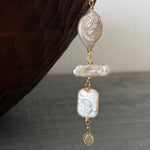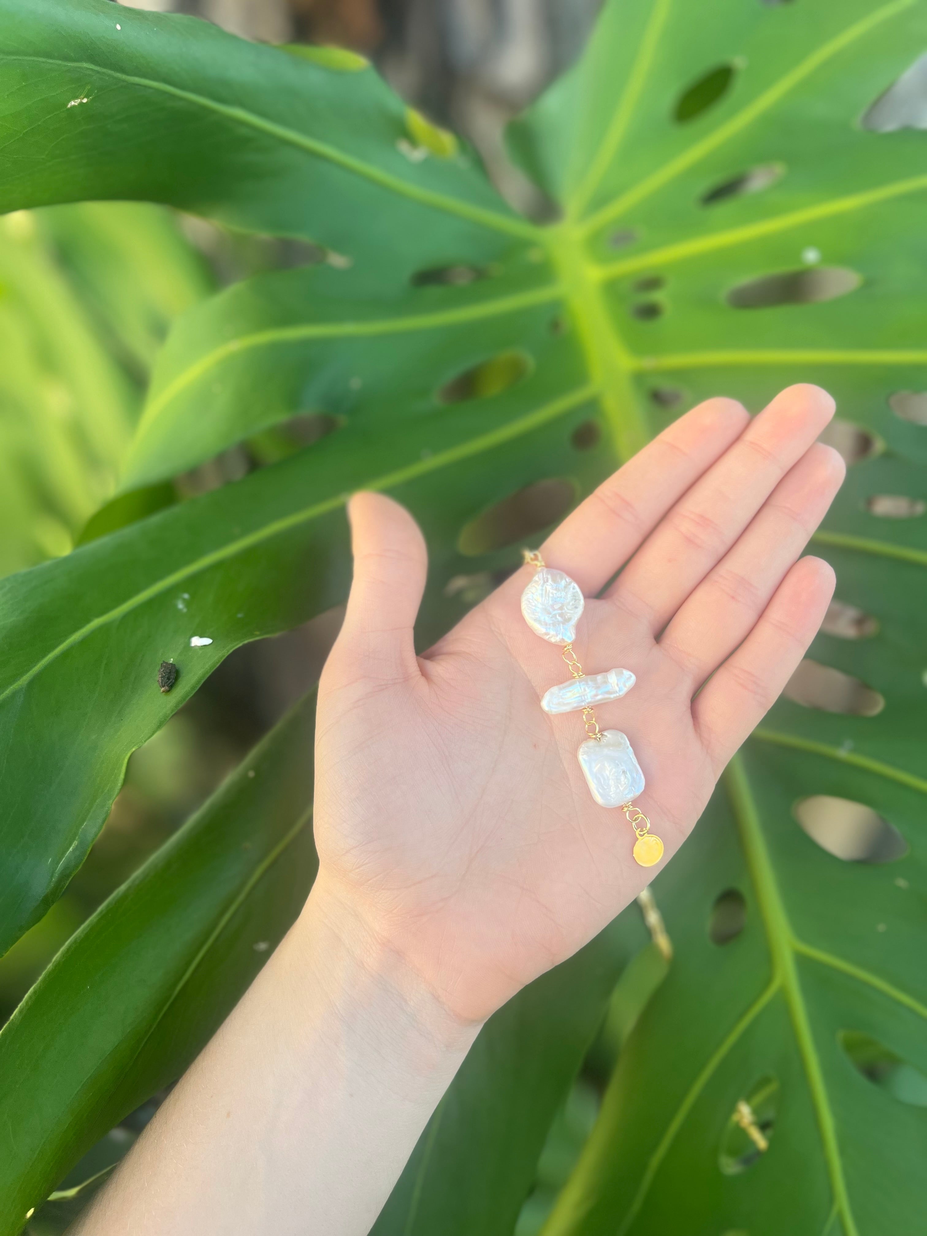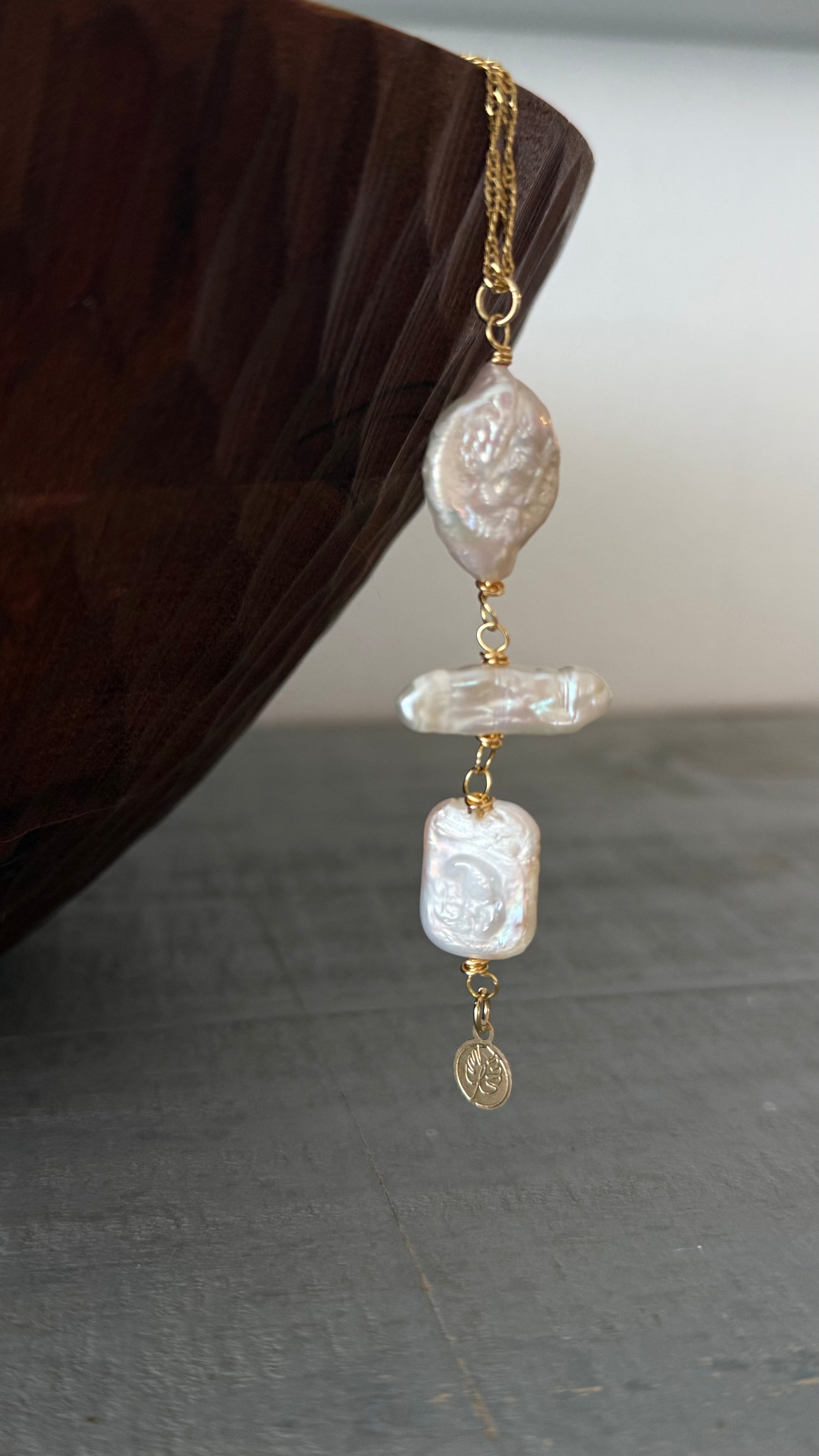 Introducing the Aurora Chain - a hand wired masterpiece featuring a mix of fresh water square, circle, and irregular pearls. Adorned with 18k gold plated details and our signature charm, this exuberant piece is sure to turn heads and spark conversations. Elevate your style with this exclusive and sophisticated accessory.