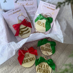 Cada pieza es hecha a mano con amor, decorada con vinyl permanente sobre acrílico transparente y adornada con una cinta sedosa en rojo o verde, perfecta para destacar entre las luces navideñas.