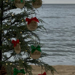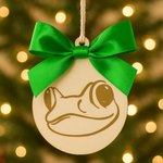 Cada pieza es hecha a mano con amor, decorada con vinyl permanente sobre acrílico transparente y adornada con una cinta sedosa en rojo o verde, perfecta para destacar entre las luces navideñas.