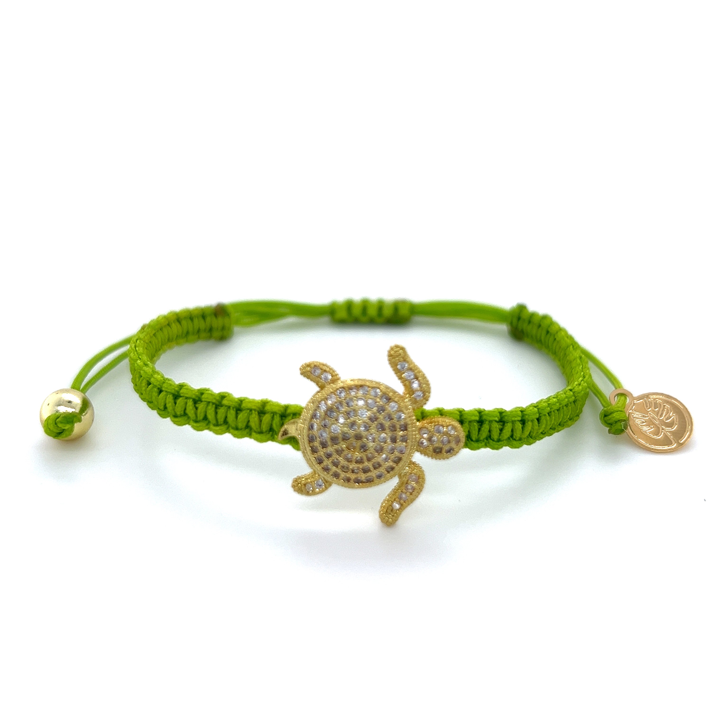 Add a touch of elegance with our Turtle Bracelet. This carefully handcrafted piece features an 18k gold plated turtle focal piece adorned with sparkling rhinestones. The green macrame adjustable bracelet and signature charm make it a truly exclusive addition to your collection.