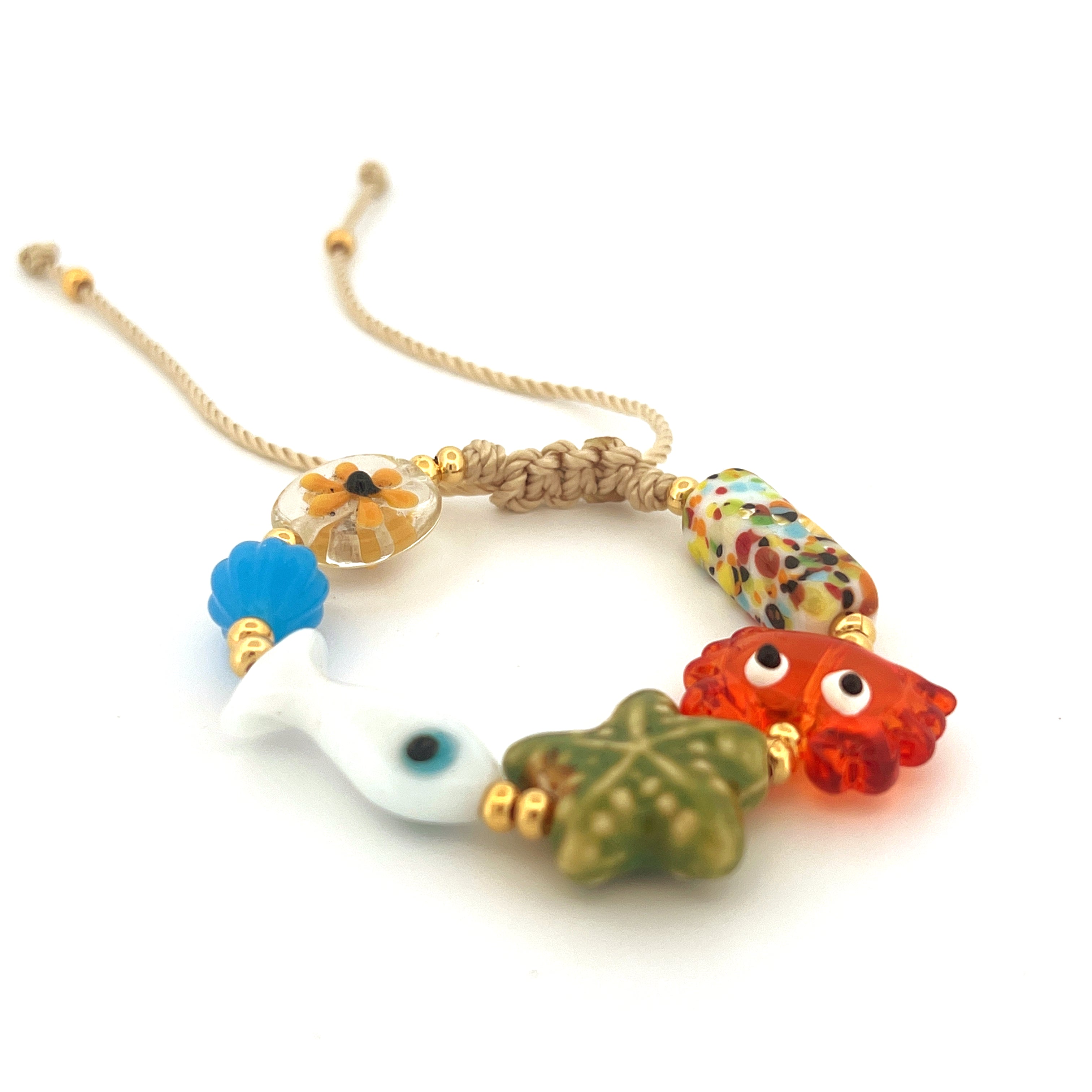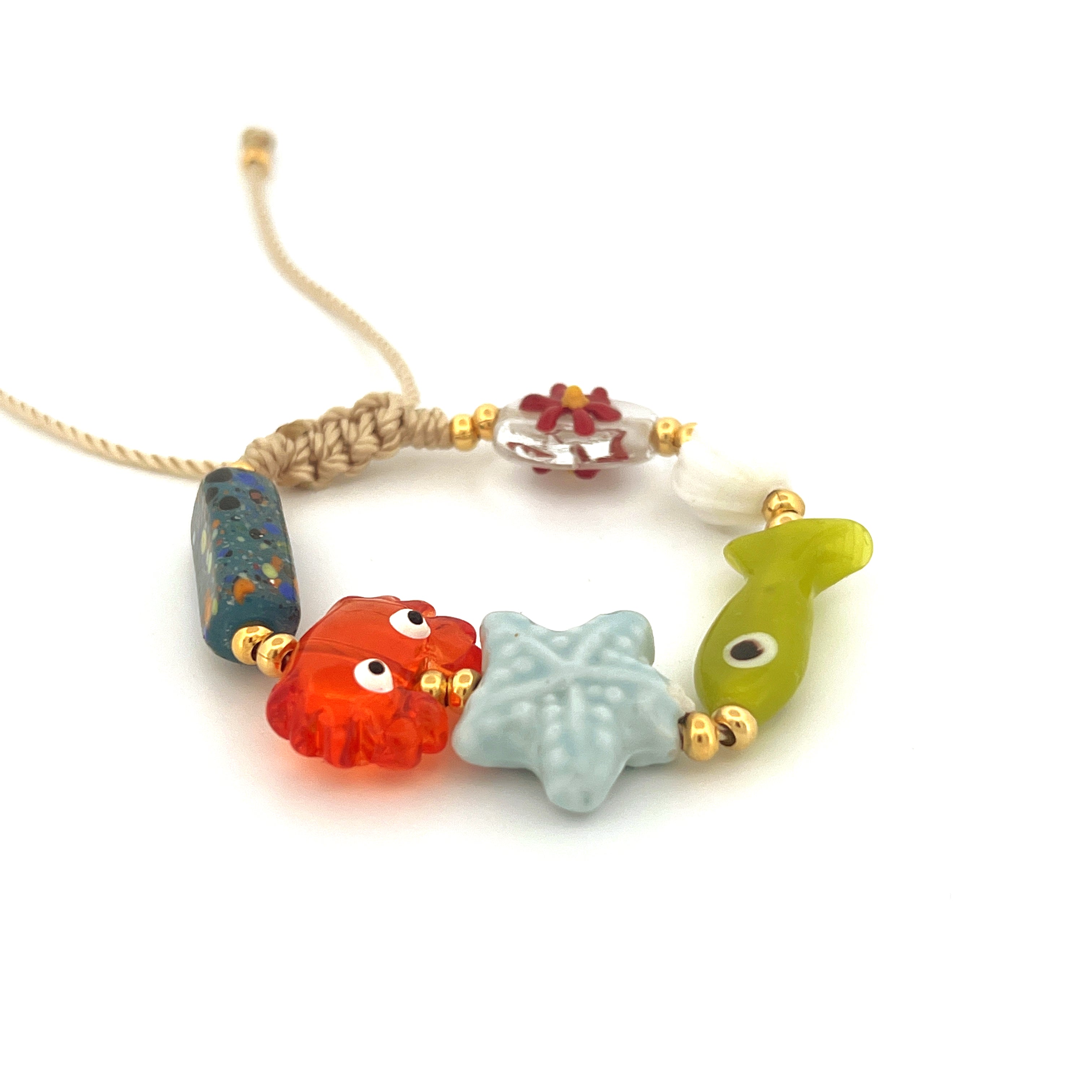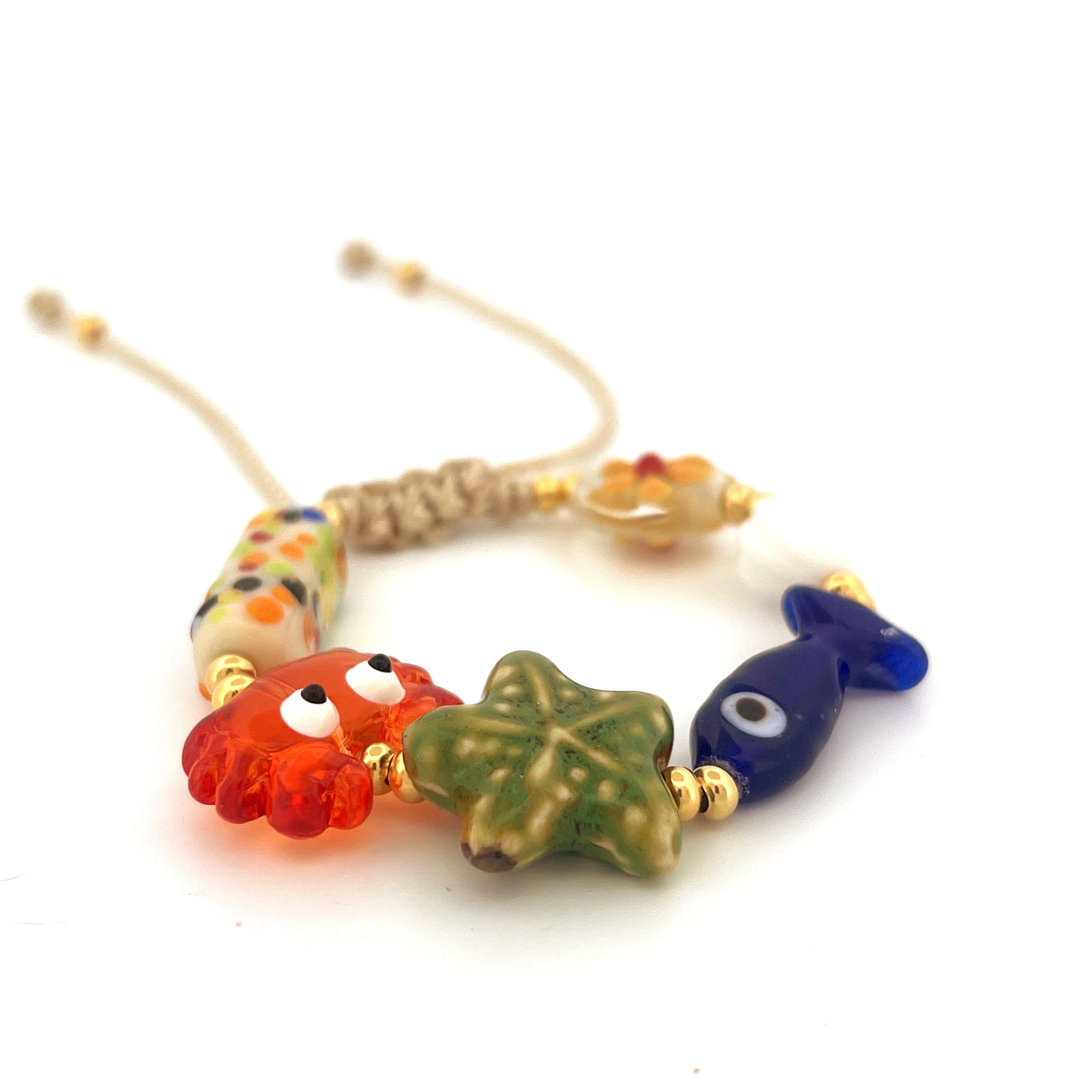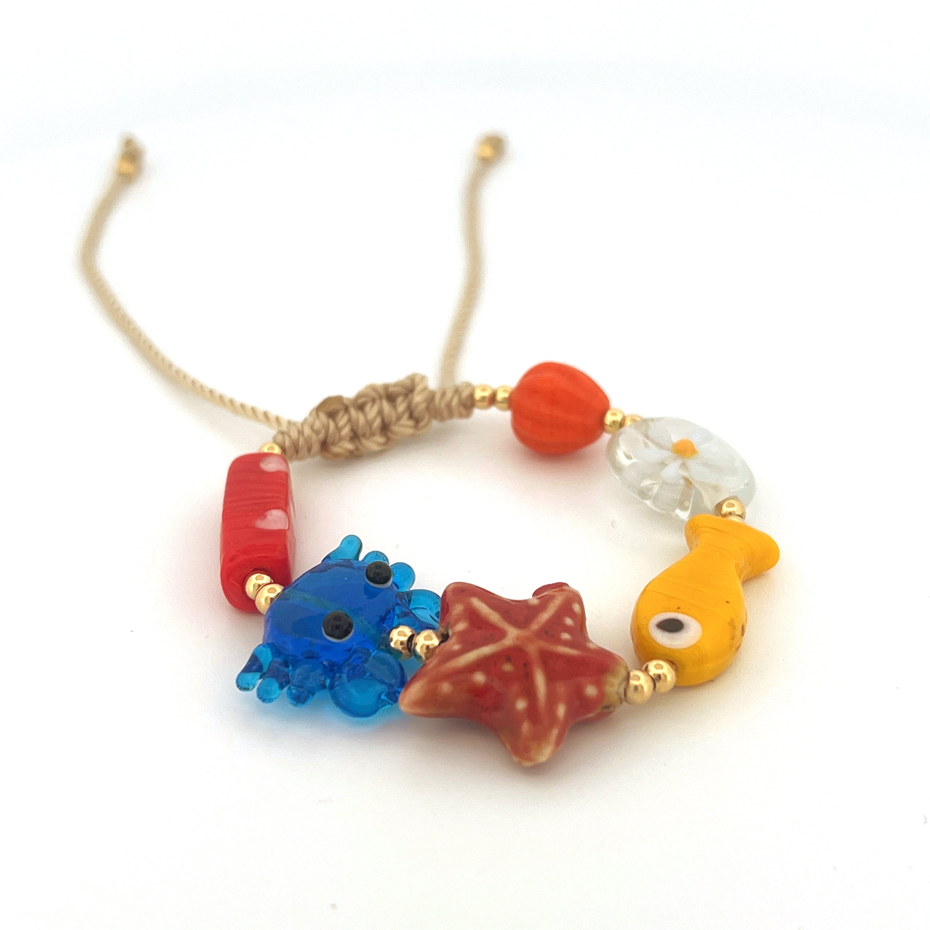 Elevate your summer style with the Vale Vale Bracelet. Its colorful lampwork beads, handcrafted macrame design, and seaside-inspired charms (starfish, fish, and crab) make it a must-have for any beach lover. Plus, the adjustable fit ensures it will be a perfect addition to any outfit.