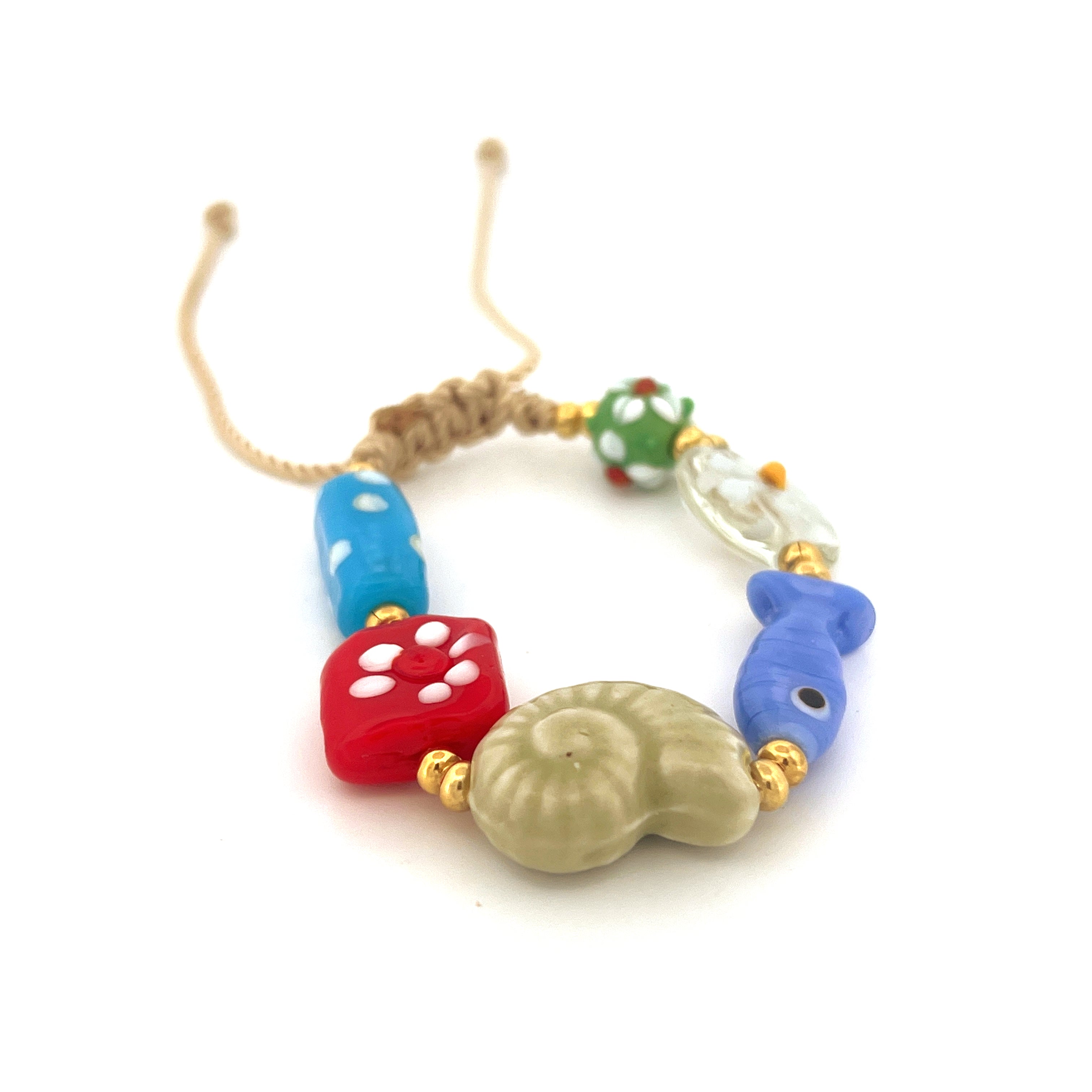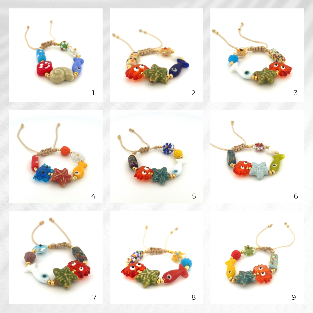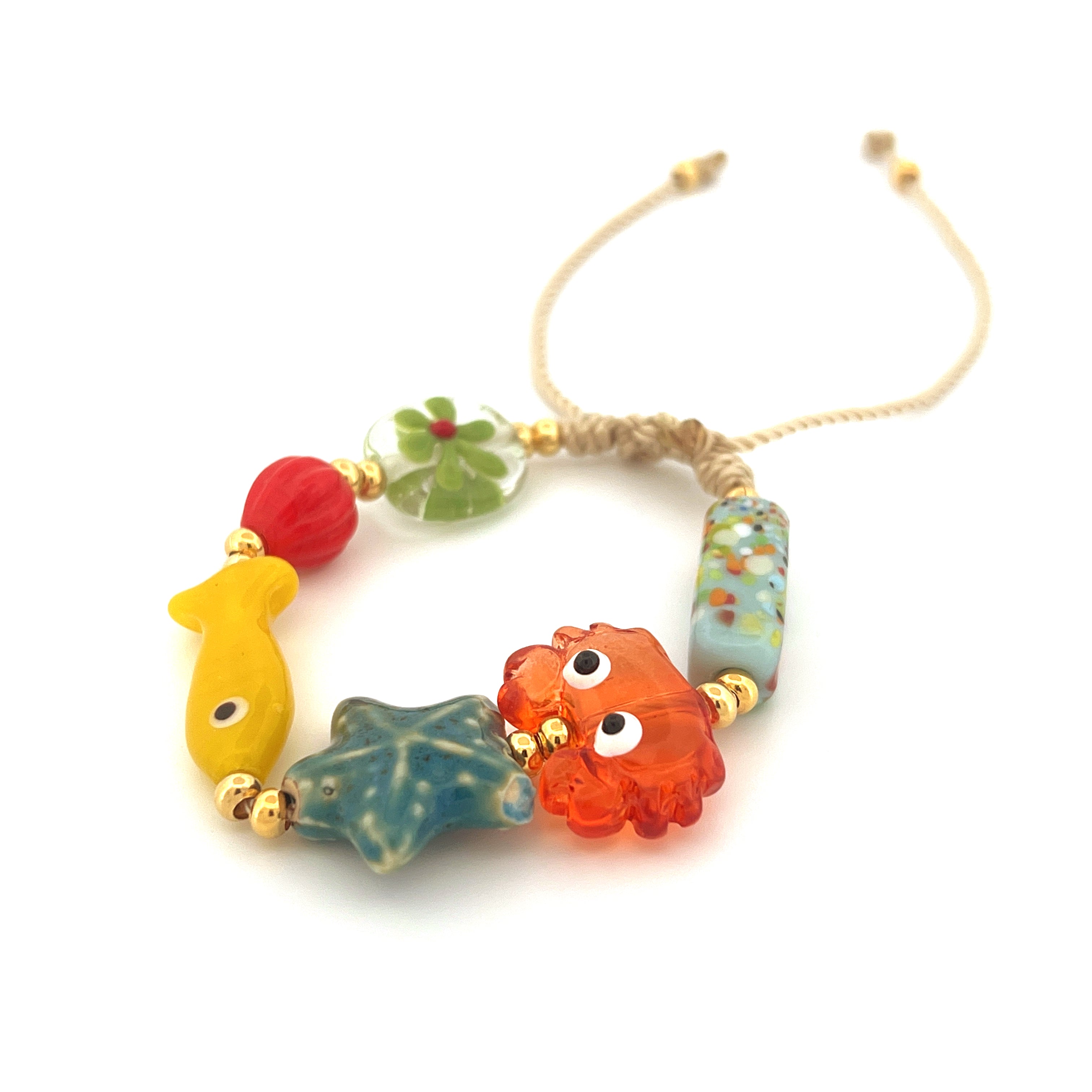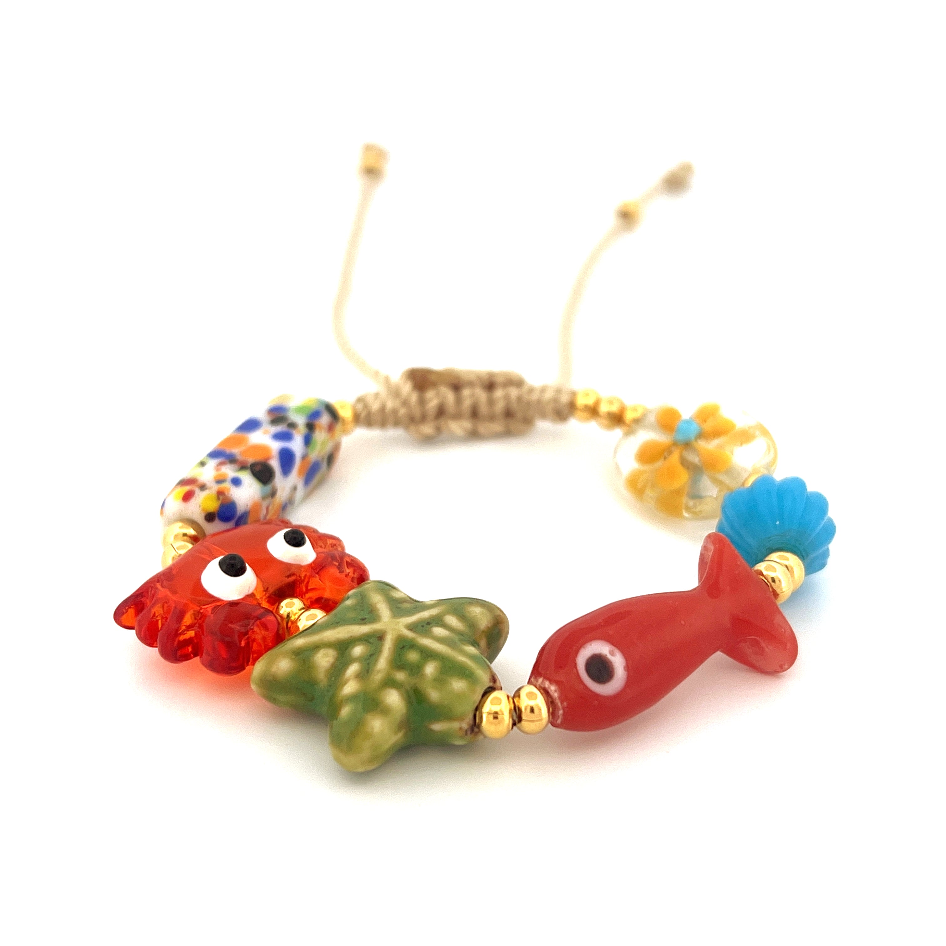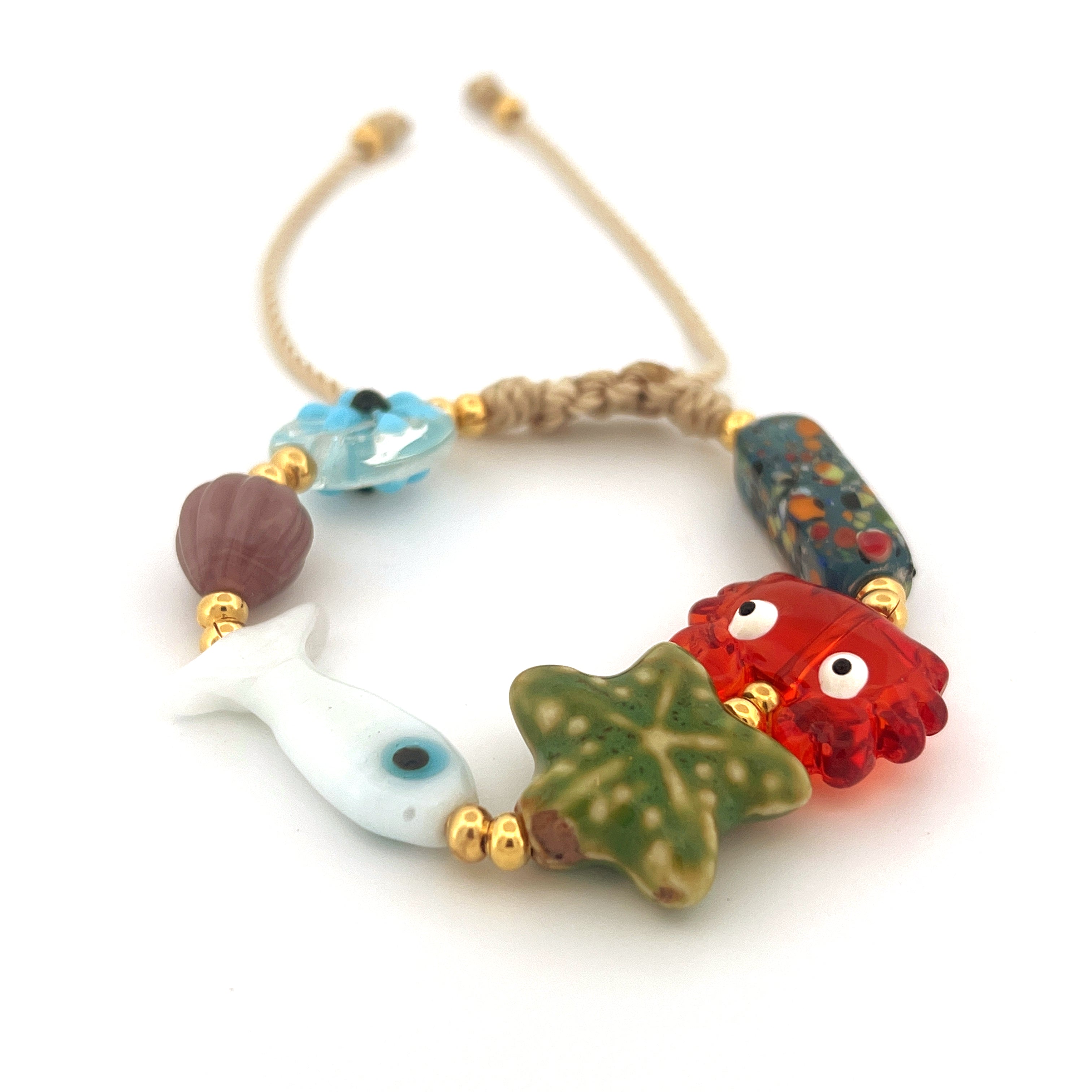 Elevate your summer style with the Vale Vale Bracelet. Its colorful lampwork beads, handcrafted macrame design, and seaside-inspired charms (starfish, fish, and crab) make it a must-have for any beach lover. Plus, the adjustable fit ensures it will be a perfect addition to any outfit.