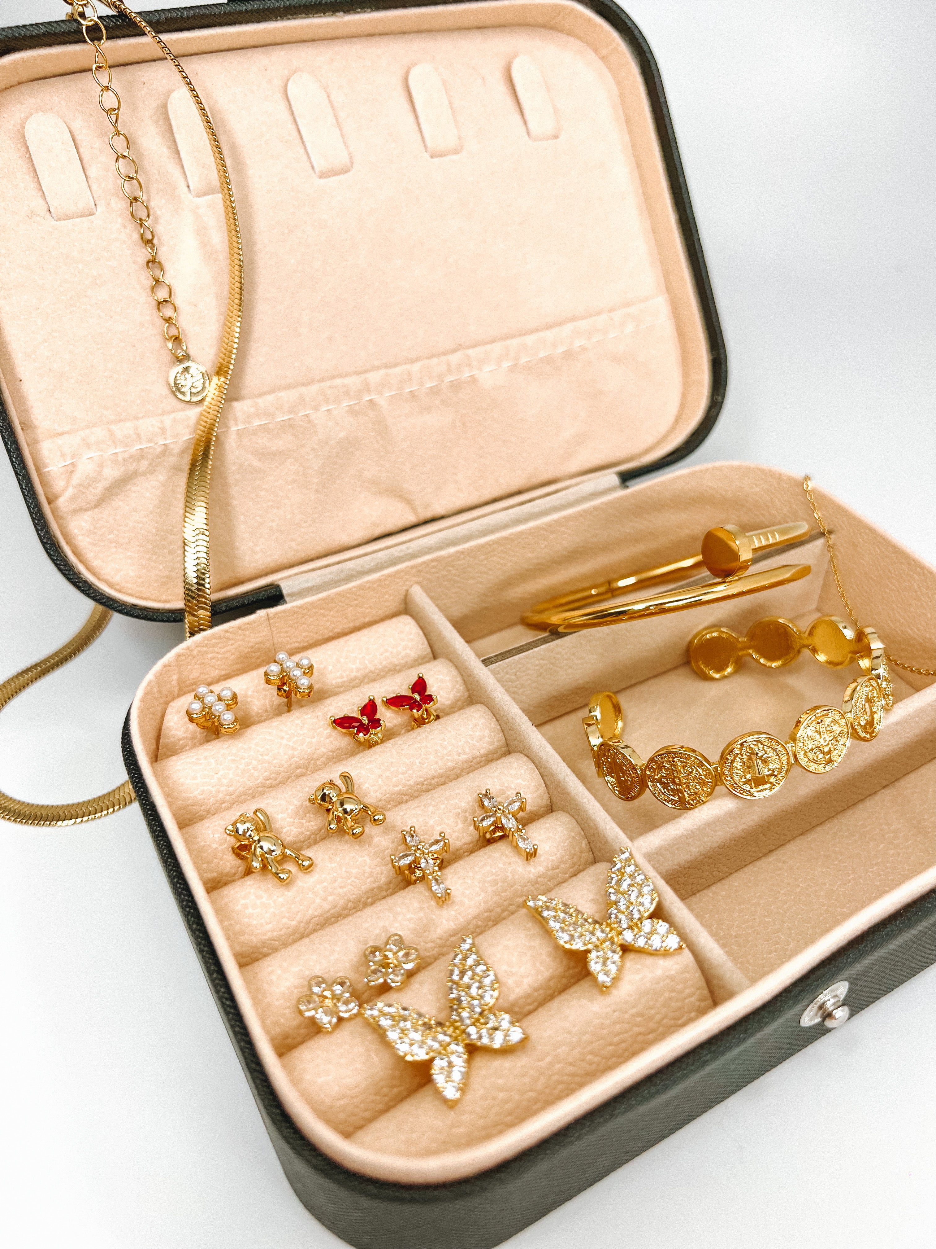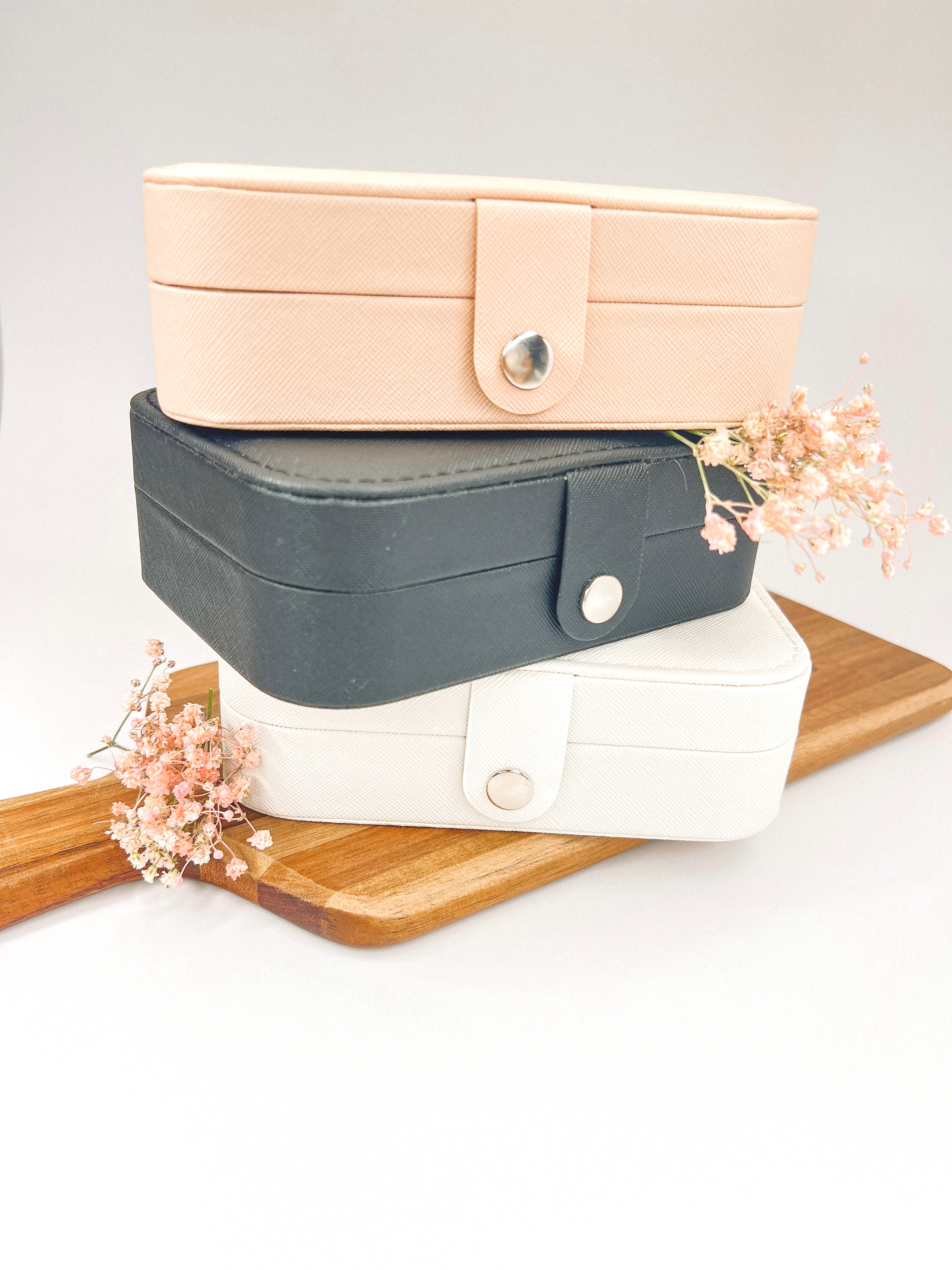 Organize your jewelry with this beautiful and spacious Jewelry Box. Available in two colors white and pink. Perfect for traveling, organizing your jewelry space or to have it in the car.