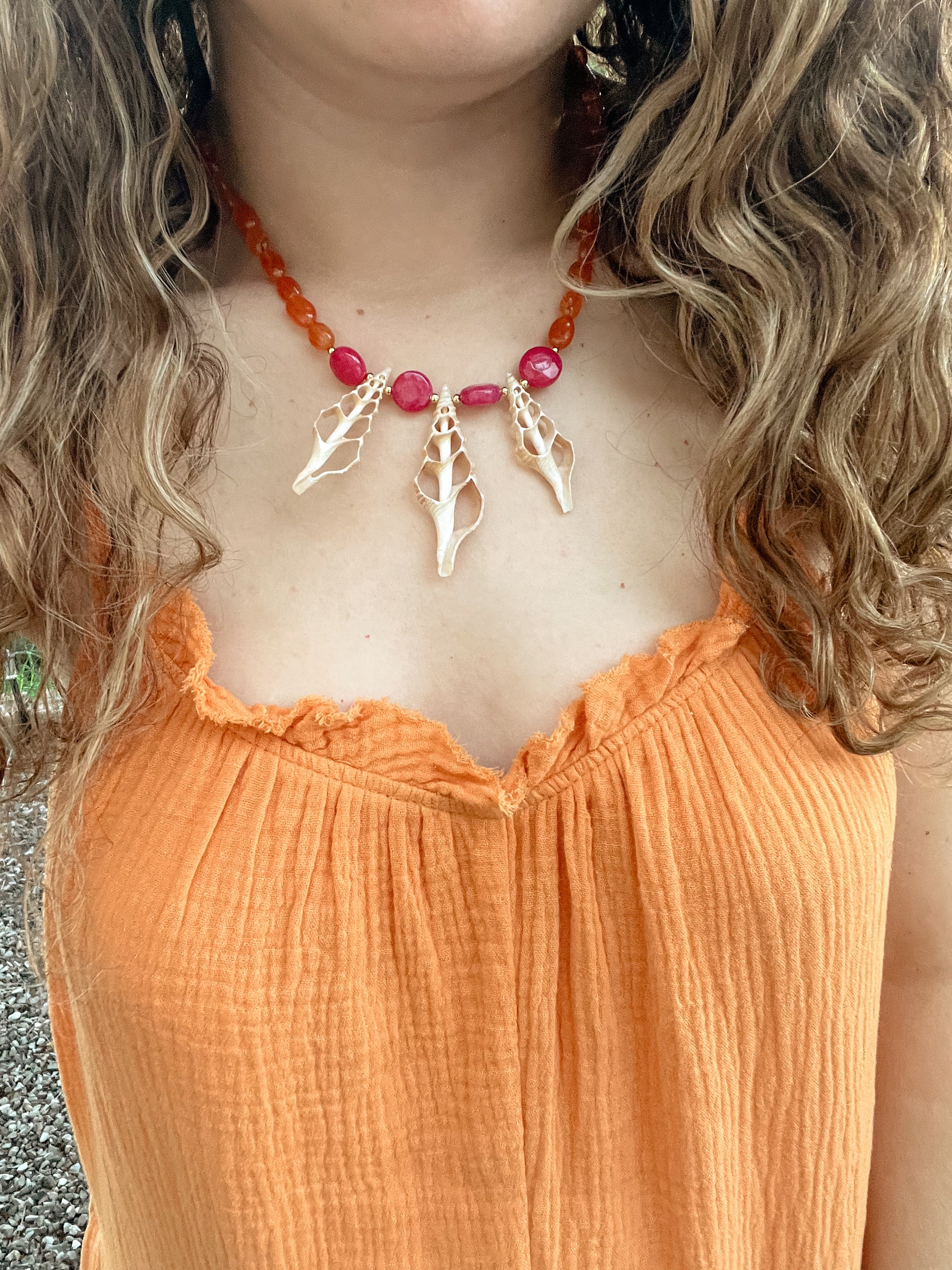 Elevate your summer look with the exclusive Bali Necklace, featuring stunning Fuschia Jasper and Orange agathas, accented by beautiful natural seashells. The 18k gold plated detail and signature charm add a luxurious touch. Adjustable between 16" to 18", it is the perfect accessory for any summer outfit.