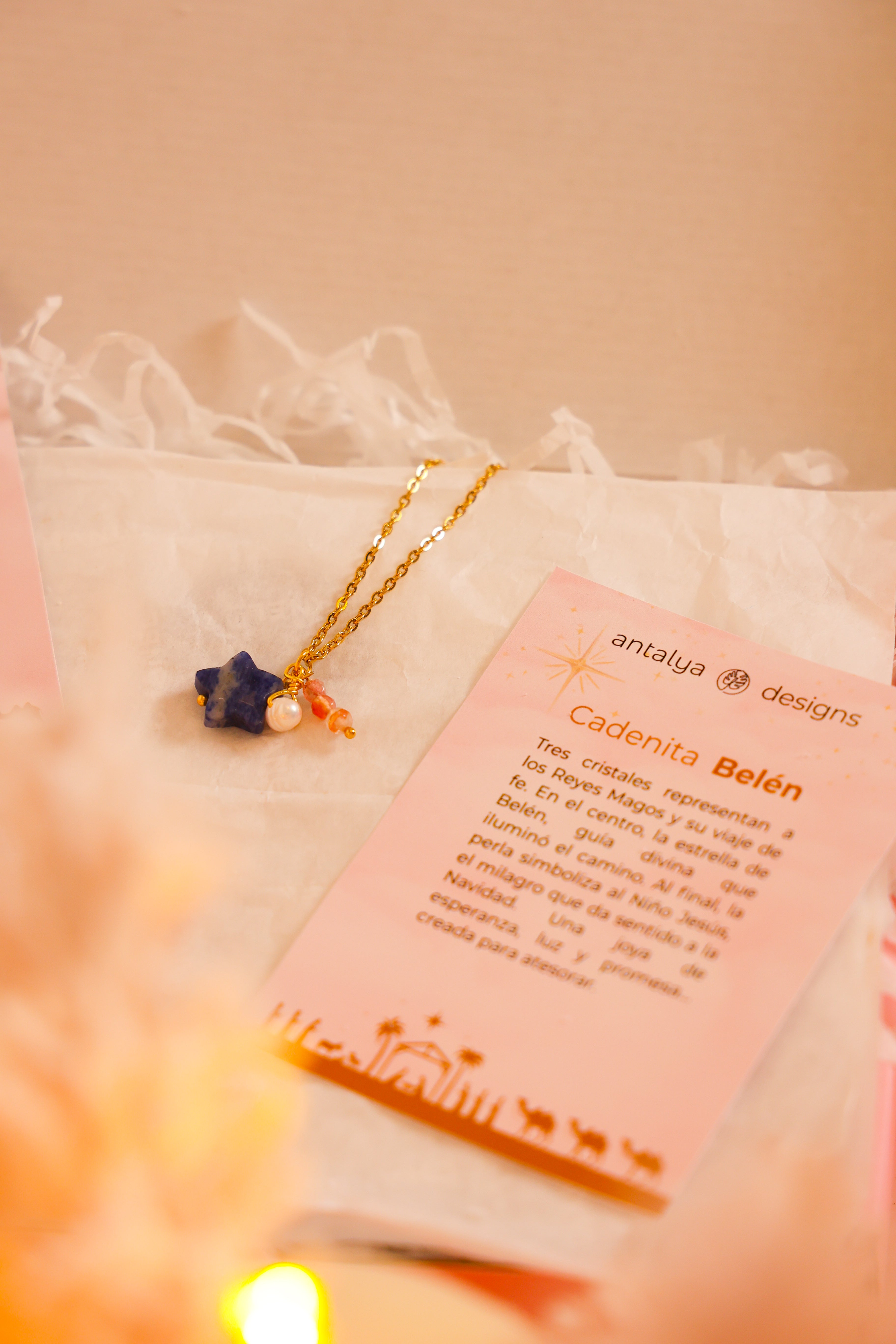 Inspirada en la estrella que iluminó el camino hacia lo divino, simboliza guía, claridad y esperanza.