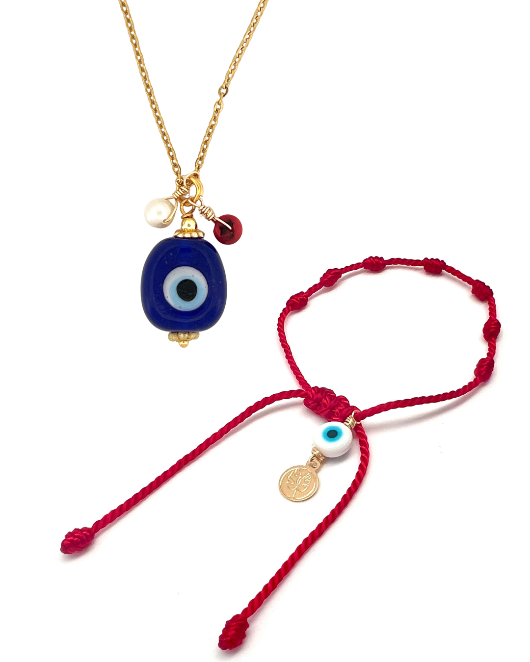• Cadena Protección: alambrada a mano con ojo en cerámica (azul o blanco), perla natural y coral rojo para mantenerte rodeada de luz y protección.