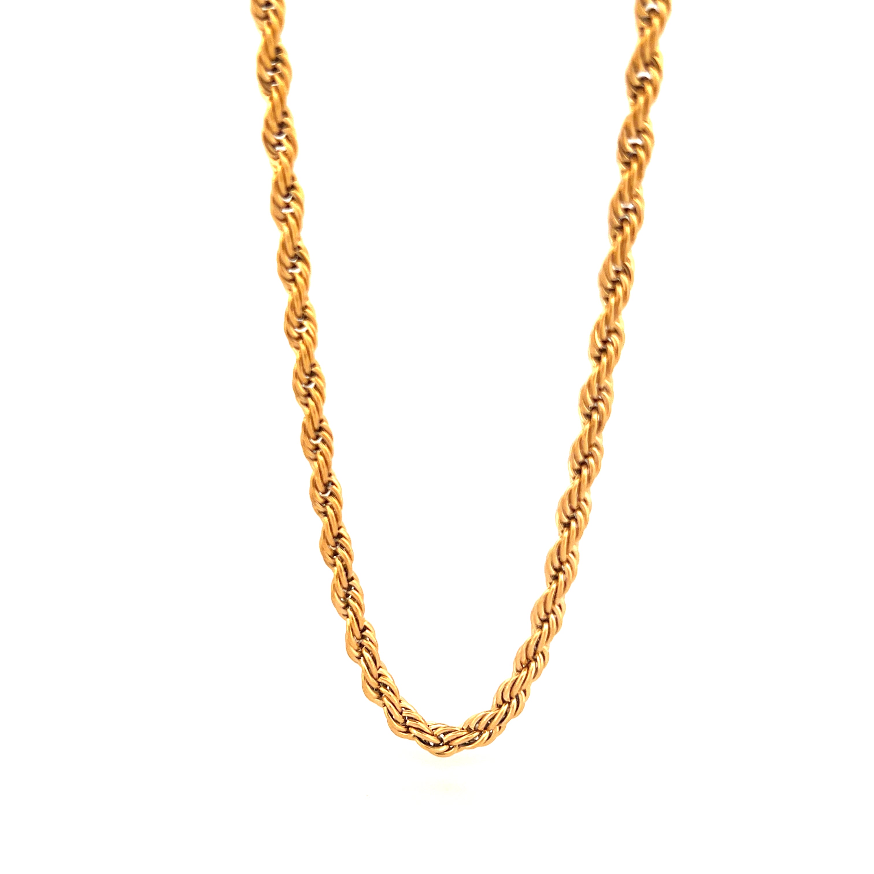 Indulge in luxury with our Rope Chain. Made of durable 304 stainless steel and plated in real 18K gold, this rope chain necklace is perfect for layering or wearing on its own. With a lobster claw clasp, it's easy to put on and adds a touch of elegance to any outfit. At 19.7 inches long and 4mm wide, it's the perfect size for everyday wear. Elevate your style with this exclusive piece.
