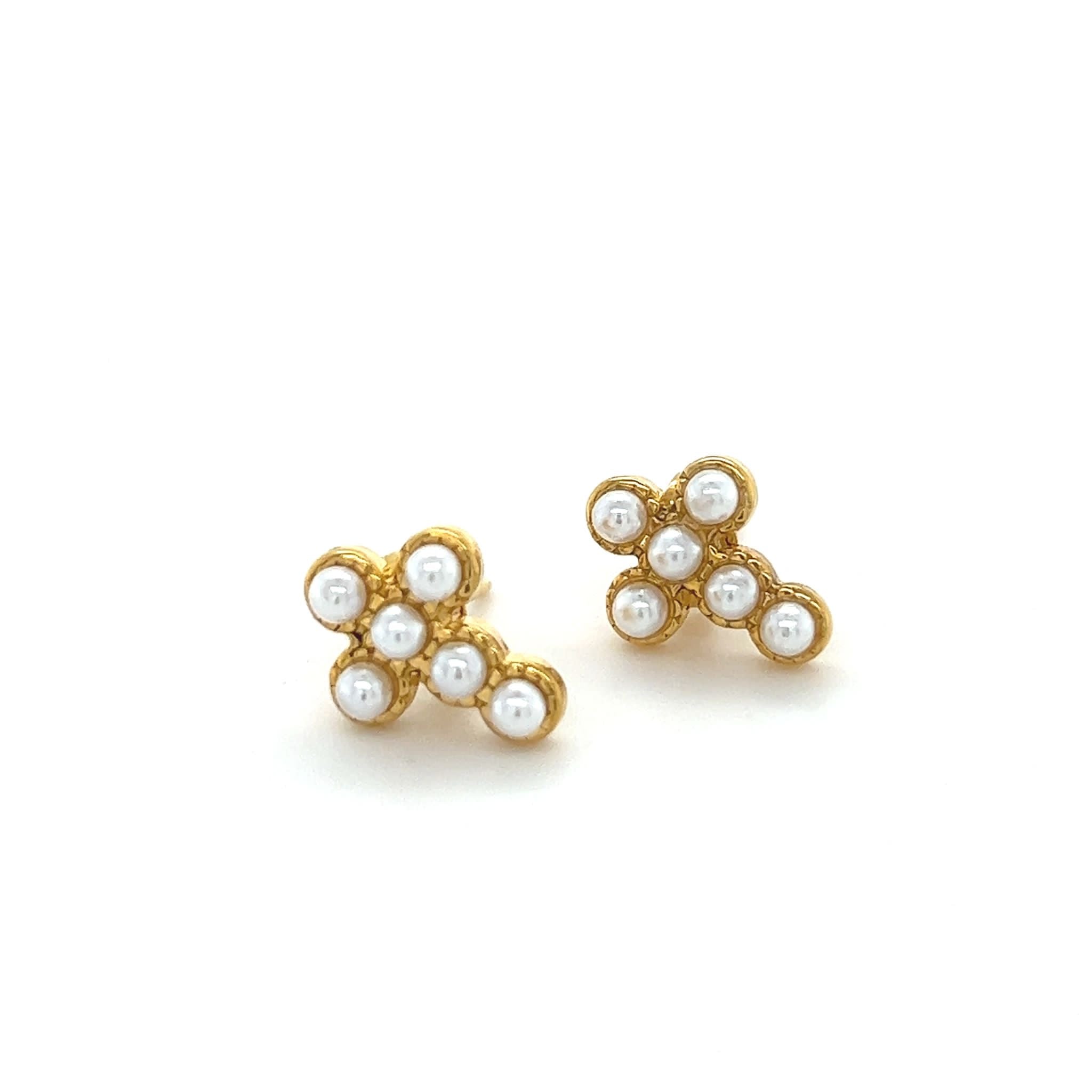 Estos exquisitos pendientes de perlas en forma de cruz son el detalle perfecto para agregar un toque de elegancia a cualquier conjunto. Elaborados con cuidado con perlas y chapado en oro de 18 quilates, estos delicados pendientes irradian sofisticación y lujo. Eleva tu estilo con estas bellezas atemporales.