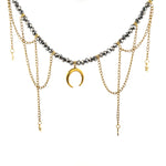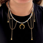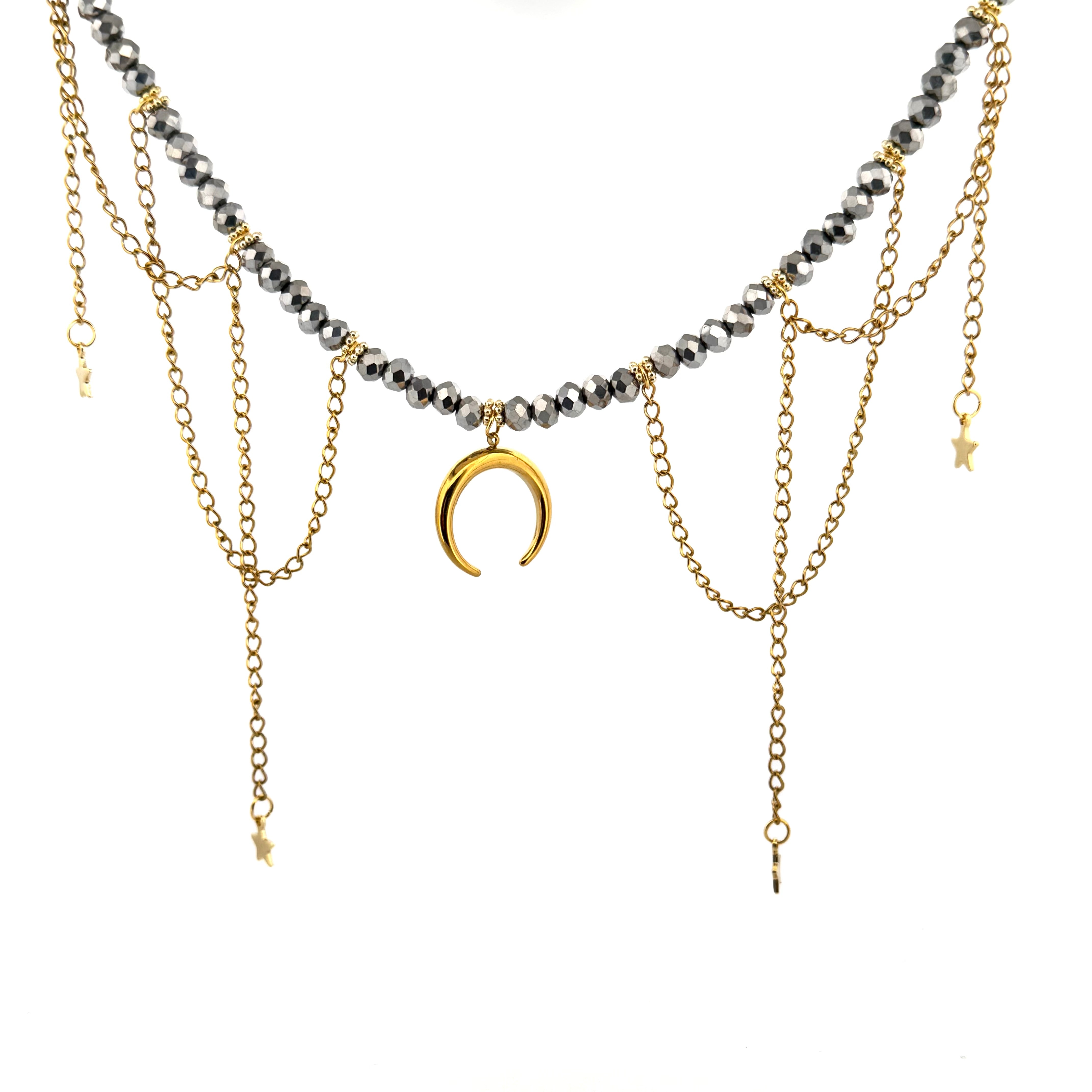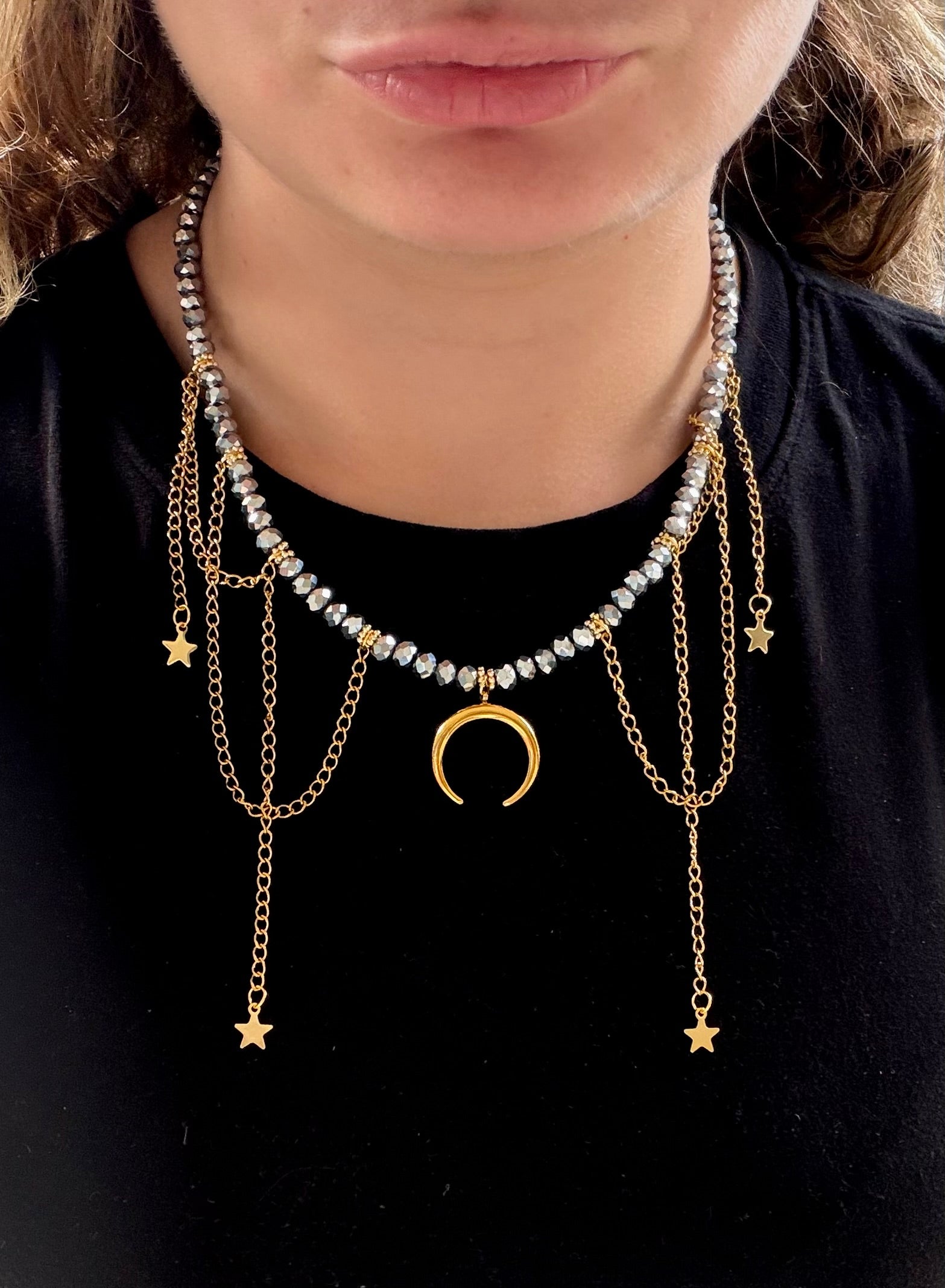 Indulge in elegance with our Luneta Necklace. Handmade with rondelle silver beads and 18k gold plated details, this statement piece features crossed chains, star accents, and a stunning moon centerpiece. Elevate any look with this sophisticated and exclusive necklace.