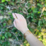 Indulge in luxury with the Solstice Cuff. This stunning piece features 18k gold plating for a touch of opulence. With its adjustable design, it can be customized to fit any wrist size. The multi-line and orbital details add a unique and sophisticated touch, making it the perfect statement accessory for any occasion. Upgrade your style with the Solstice Cuff.